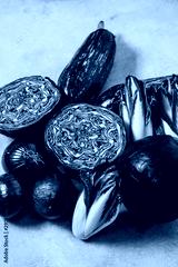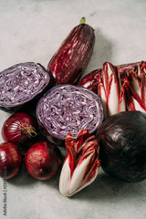 Top view of several purple vegetables. Red onion, eggplant, escarole and purple cabbage on gray background. Antioxidant, detox and healthy vegetables.
