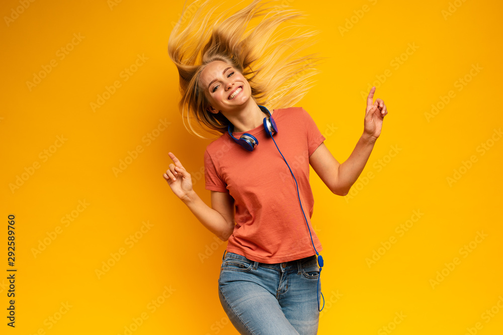 Blonde girl listens to music with headset. Joyful expression on yellow background