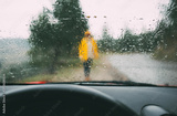 Hitchhiker silhouette in raincoat in front of car windshield. Rain drops on windshield