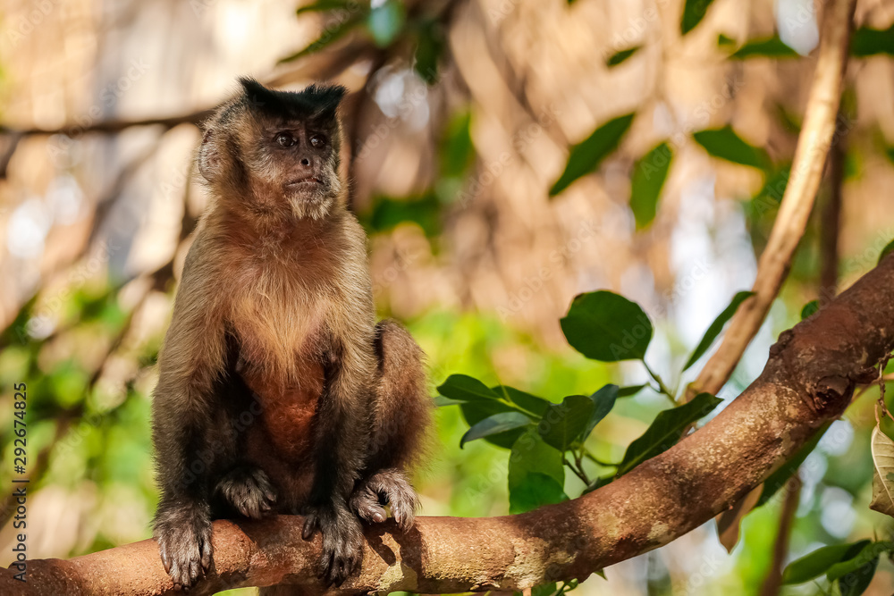 Hooded Capuchin sitting upright, on a branch against defocused leaves, looking sideways, partly in the sun, Lagoa das Araras, Bom Jardim, Mato Grosso, Brazil
