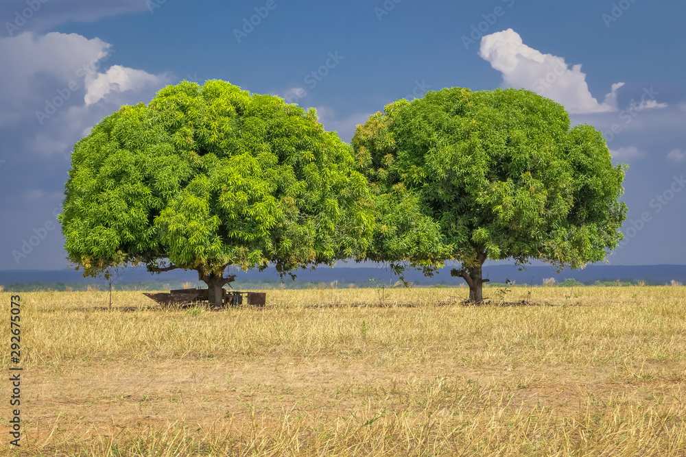 View to two trees with dense green foliage in a harvested yellow field against dark blue sky and white clouds, Mato Grosso, Brazil