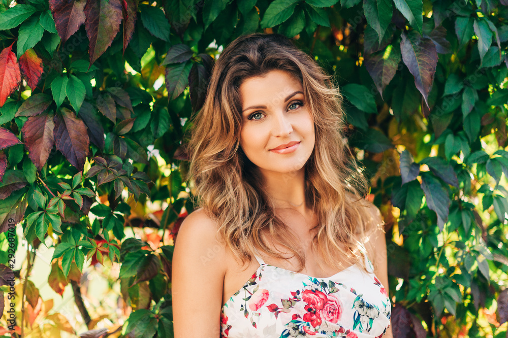 Outdoor portrait of beautiful woman wearing floral dress, posing in sunny garden