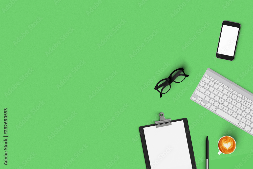 keyboard , coffee ,smartphone , notebook on the color background top view