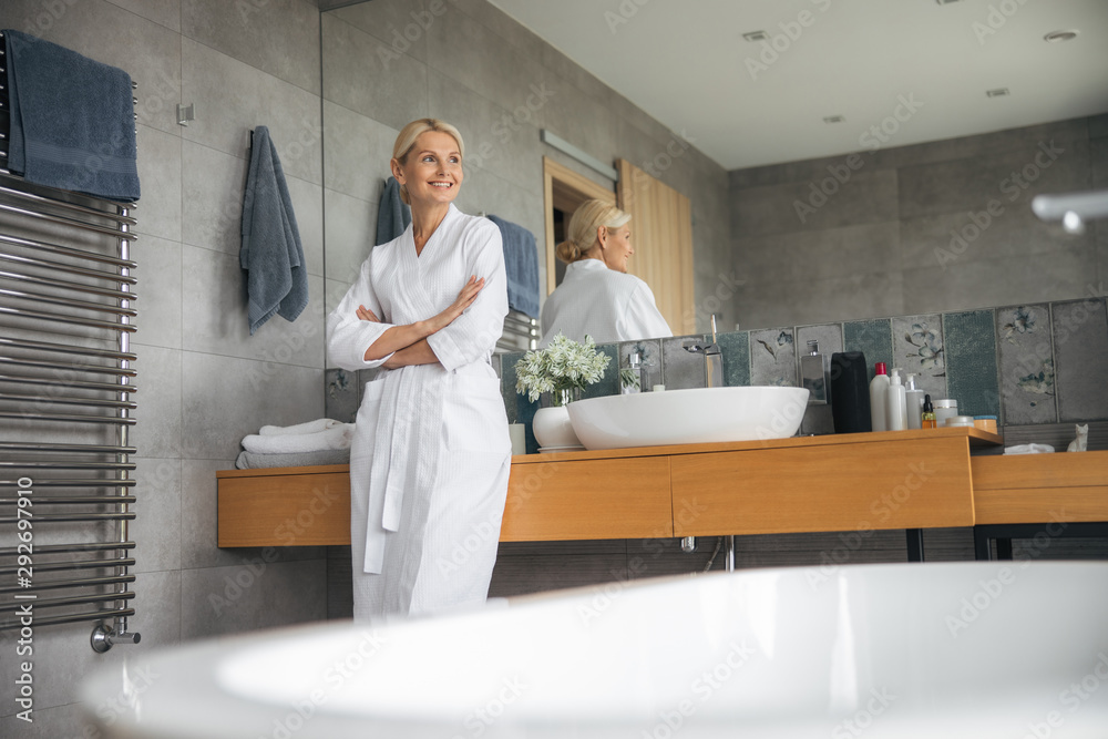 Positive delighted woman spending morning in her bathroom