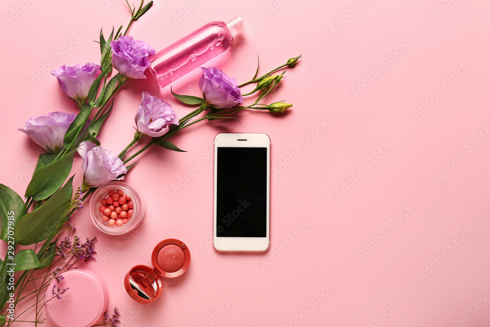 Modern mobile phone with makeup cosmetics and flowers on color background