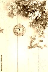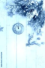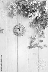 Christmas tree branch with pine cone in snow and retro style clock on a white wooden background. Winter or Christmas festive concept. Flat lay, copy space.