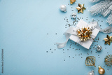 Merry Christmas and Happy Holidays greeting card, frame, banner. New Year. Noel. Christmas white, silver and golden ornaments and gift on blue background top view. Winter xmas holiday theme. Flat lay