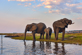 Two adult elephants and a small one (Loxodonta africana) drink along the banks of an African river