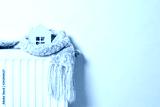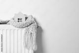 House model wrapped in scarf on radiator indoors, space for text. Winter heating efficiency