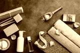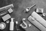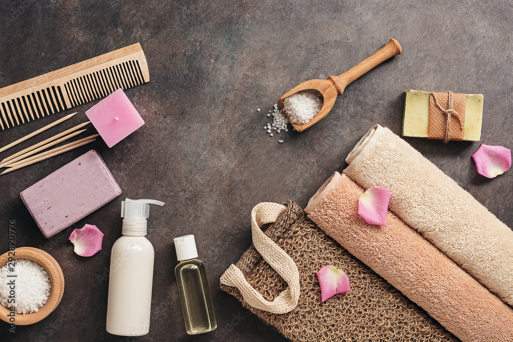 Flat lay a set of diverse bathroom accessories. Terry towel, soap, comb, oil, shampoo, loofah washcloth, sea salt on a dark rustic background. View from above.