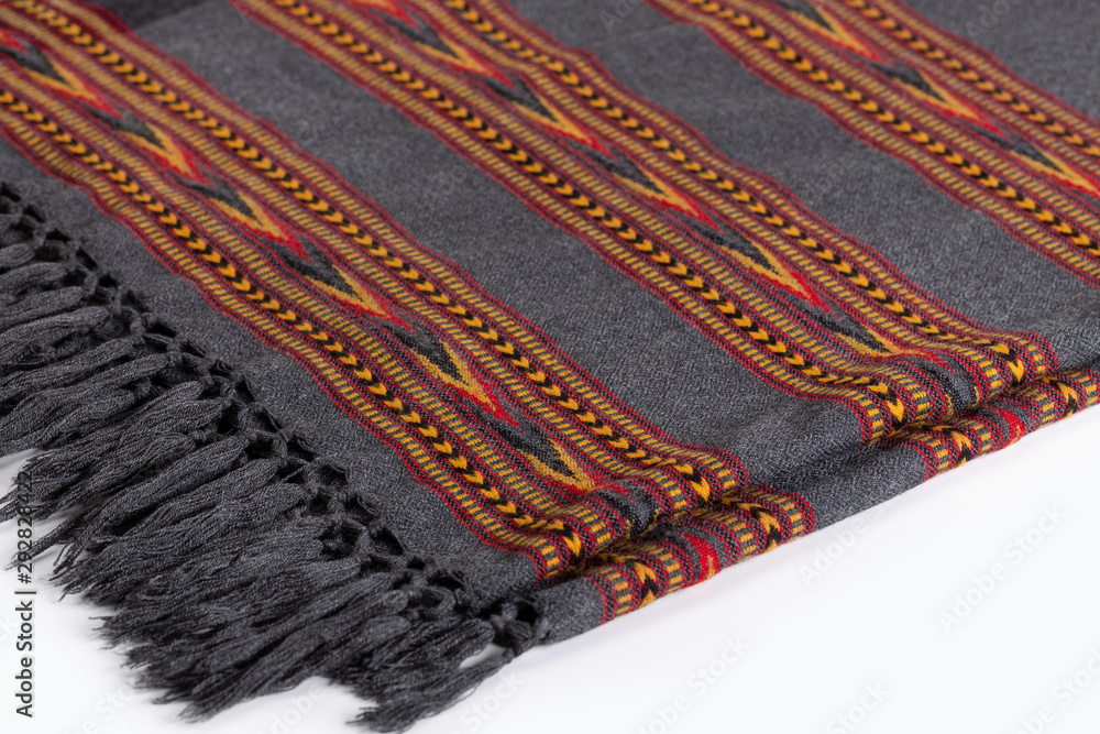 Textile plaid with ornament on wooden background. Colorful plaids, close-up. Homeliness, copy space.