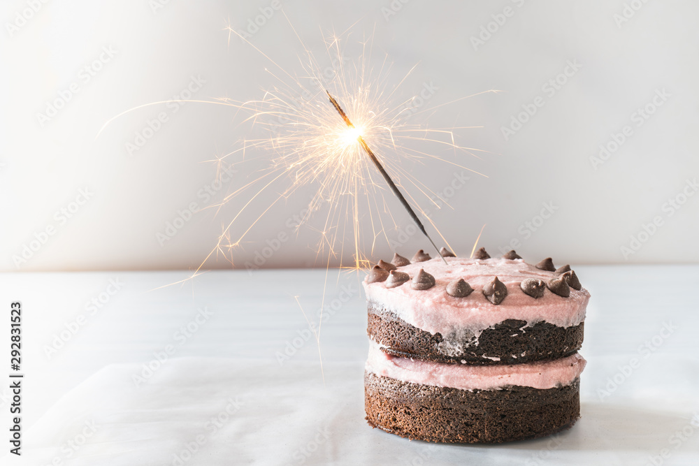 Chocolate Birthday Cake with Raspberry Frosting with Sparkler on Light Background