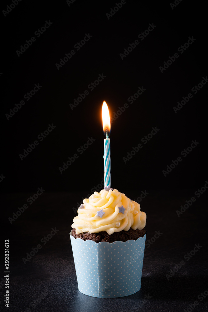 Baby Blue Single Frosted Chocolate Cupcake with Candle on Dark Background - Vertical