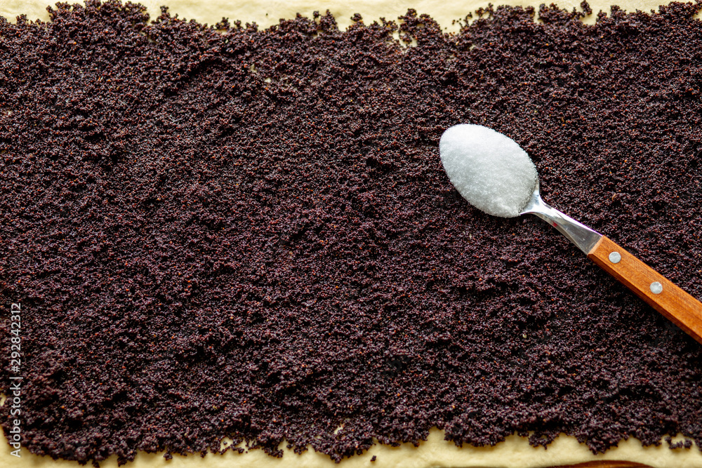 Cooking poppy seed roll together. Dough with flour and rolling pin on the board. Ready, roll out the dough. Work baker. Baking rolls with poppy seeds and pies in the kitchen.