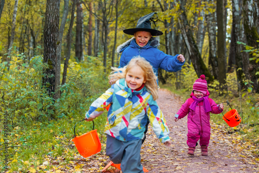 kids celebrating halloween, boy and girls trick or treating in autumn