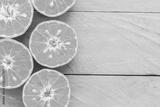 cut fresh oranges on blue wood background
