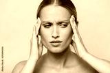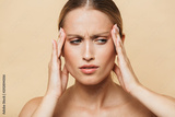 Image of sad half-naked woman rubbing her temples and looking aside