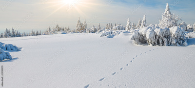 Stunning panorama of snowy landscape in winter in Black Forest - winter wonderland