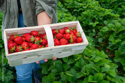 Strawberry fields in Germany, outdoor plantations with ripe sweet red strawberries ready for harvest