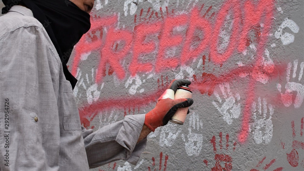 A hooded activist makes a protest graffiti on a wall