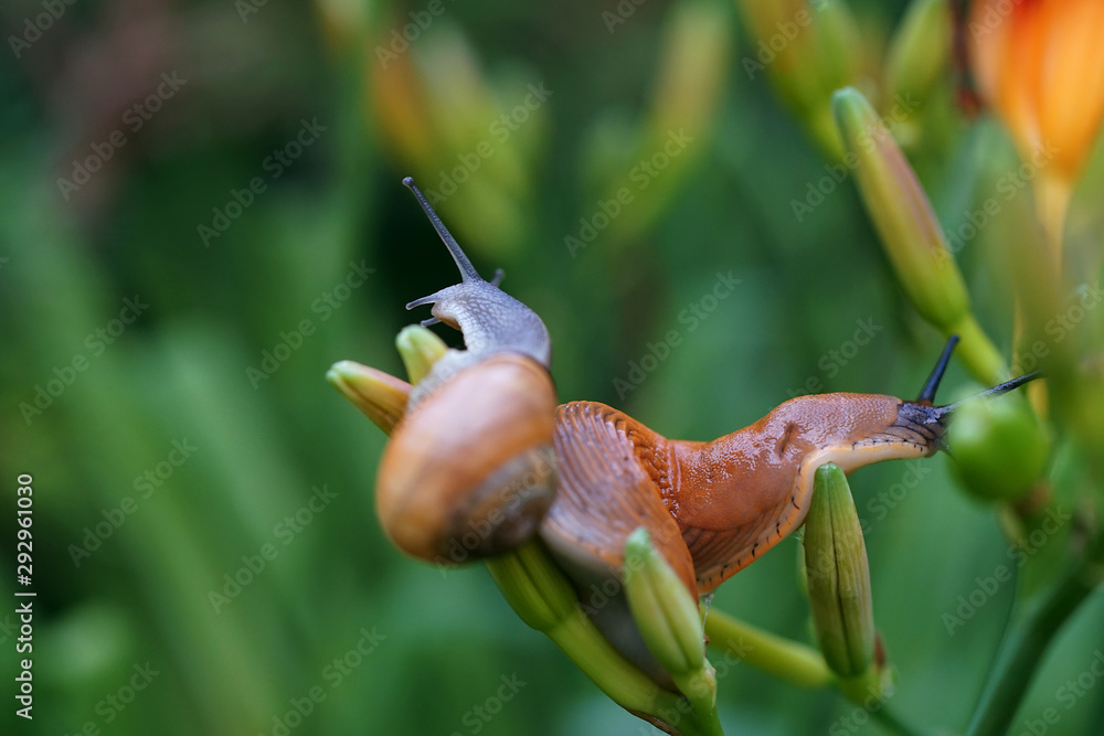 two snails on a day lily branch after a rain