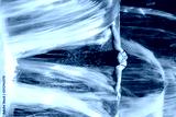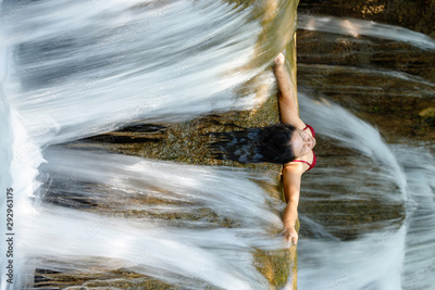 Woman inside waterfall flow