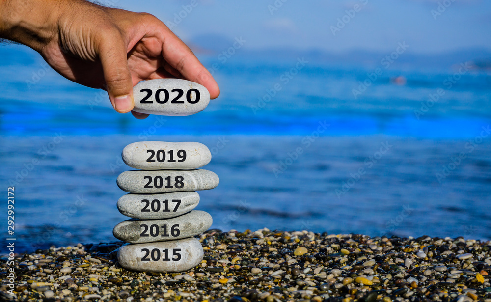 New Year 2020 is coming concept. Turn of old year 2019 change to 2020. Happy new year 2020 replace 2019. New hopes, ideas, excitement background. Man / male hand adding stone to pebble tower. Low view