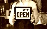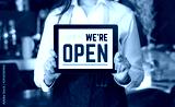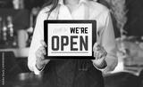 woman barista wear jean apron holding come in we are open sign on tablet to customer at bar counter with smile emotion,Cafe restaurant service concept,Owner of start up small business.