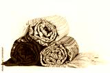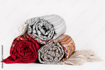 Three rolled up warm plaids. Accessories for cold weather from natural material. Copy space.