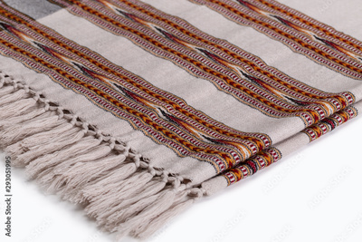 Warm plaids / stoles with a pattern on white. Accessories for cold weather from natural material. Copy space.
