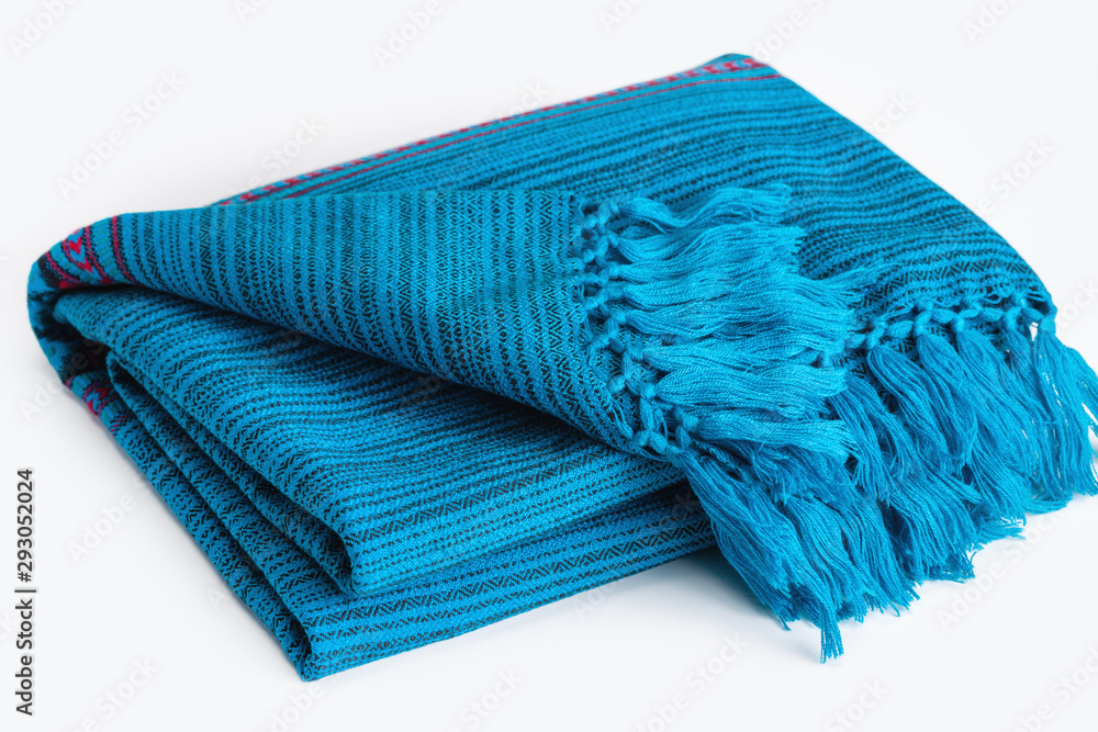 Blue folded plaid with pattern on white. Accessory for the fall. Copy space.