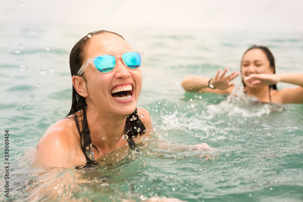 Happy friends having fun in the water at the beach.