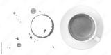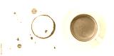 Coffee cup, stains and drops on white background