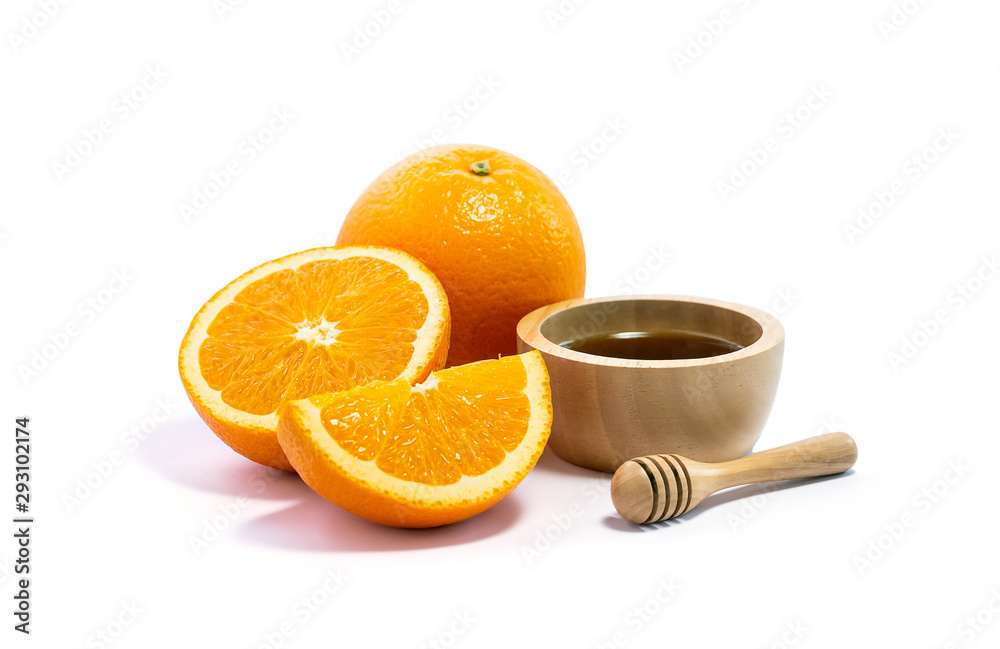 Fresh orange slice and honey in wooden bowl. isolate on white
