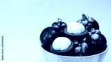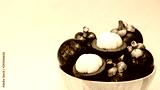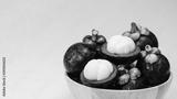 Mangosteen tropicl summer fruit in wood bowl isolated on yellow background.Queen of healthy fruit of Thailand.