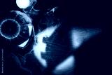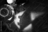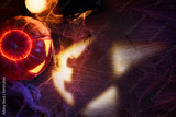 Projection of Halloween pumpkin lantern with Jack o'Lantern face on table with fallen autumn leaves and candles. Top view.