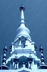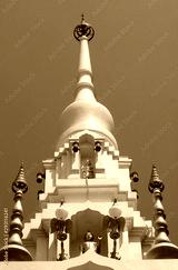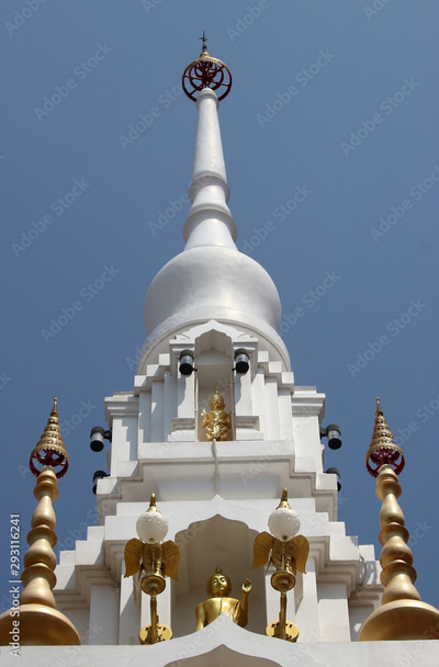 The top of a white stupa at a temple housing sacred gold relics associated with the Buddha against a blue sky background