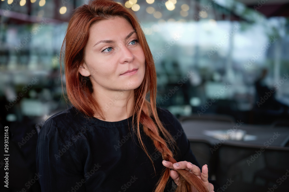Hübsche rothaarige junge Frau sitz im Kaffee am Fenster und schaut verträumt