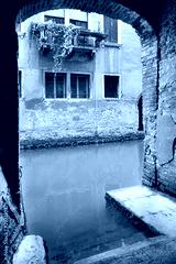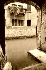 In Venice. Exit to water on one channel and a view of the balcony with flowers