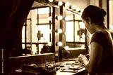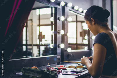 Asiayoung girl dancer in backstage using brush color on face looking mirror makeup room