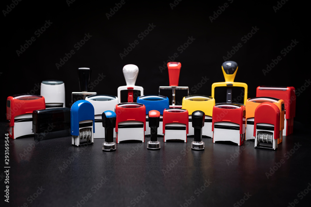 Stamps, seals and date stamps. Colorful mechanisms of rubber stamps on a black background