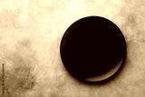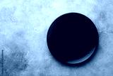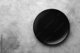 Black plate on stone table top view. Empty space for menu or recipe.