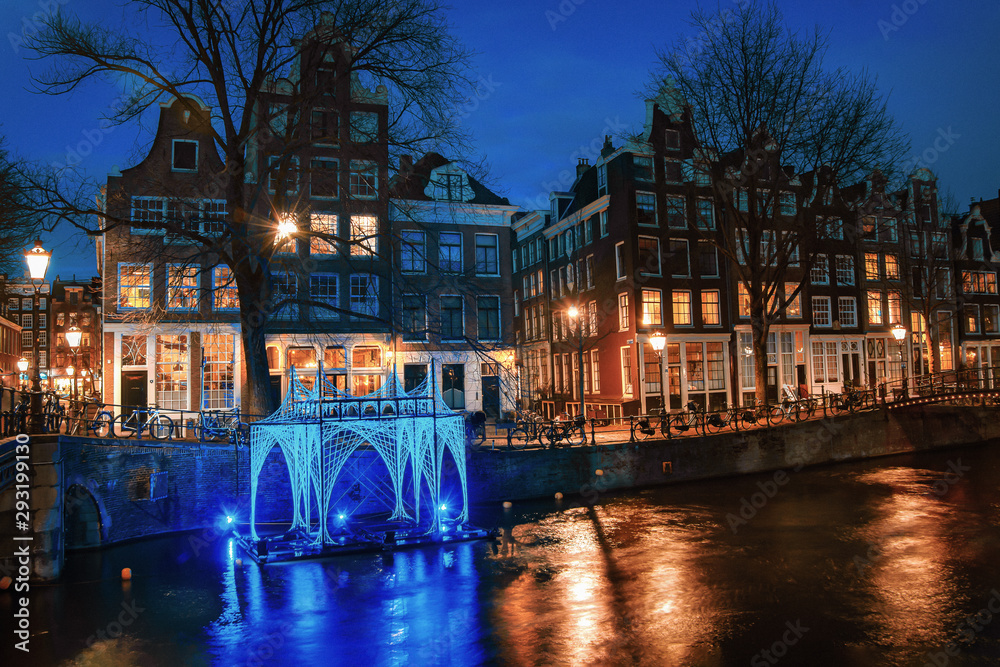Light Festival Amsterdam, floating blue light object on the in the canal Brouwersgracht in the old town of Amsterdam