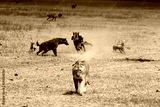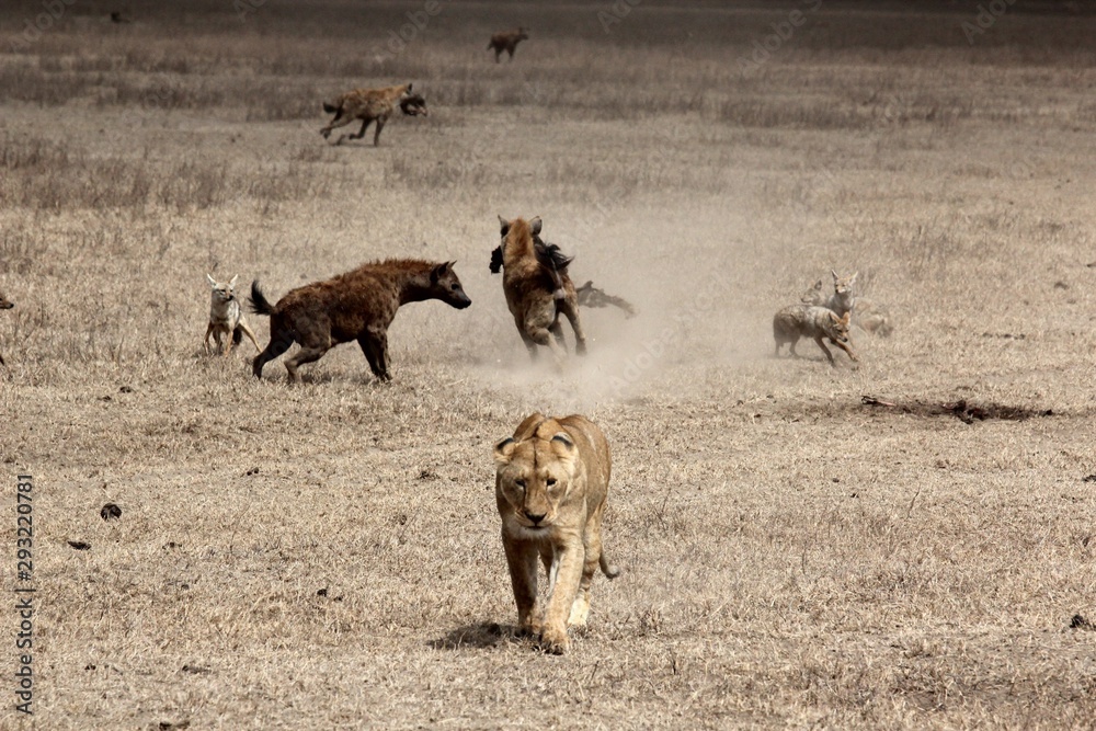 Beautiful shot of a lion walking with hyenas fighting in the background
