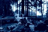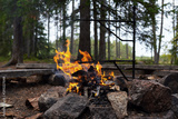 Space for camping with bonfire. Stones, woods, and benches of logs in wild forest. Place for camp with campfire on meadow among trees in wilderness.