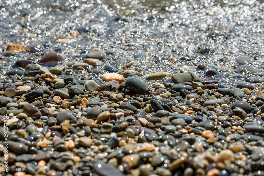 Wet pebbles and sea waves-the texture of the sea coast.
