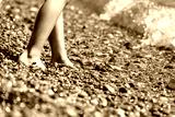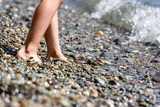 Wet pebbles, sea waves and child's feet-the concept of a beach holiday