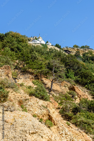 Crimea, Balaklava, September 15, 2019: monastery of St. George and Jasper beach, top view