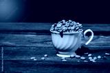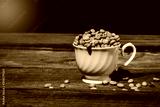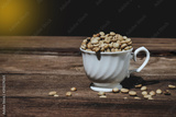 Organic Raw coffee beans in coffee cup on wood table.