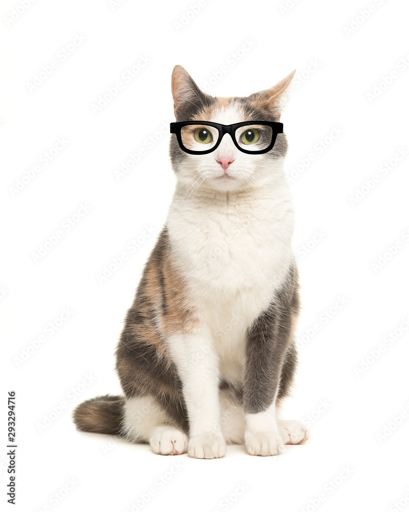 Cat sitting seen from the front facing the camera wearing black glasses isolated on a white background
